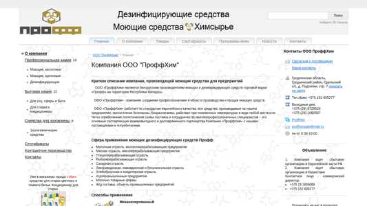 | AI-анализ | The website is for Company OOO ProffHim based in Grodno, Belarus, specializing in the production and sales of cleaning, sanitizing, and decontaminating agents, food additives, and industrial chemicals. Their product range includes caustic soda, nitric acid, and other cleaning solutions. The company is both a manufacturer and a wholesaler. |