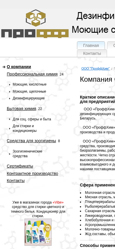 | SEO-описание | Моющие средства для предприятий. Подробная информация о компании ПроффХим (Гродно): широкий выбор моющих, чистящих и дезинфицирующих средств, пищевых добавок, промышленной химии. Тип предприятия ООО ПроффХим: Производитель, Оптовый продавец |