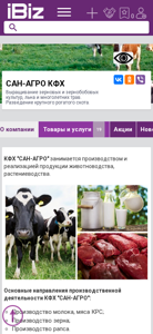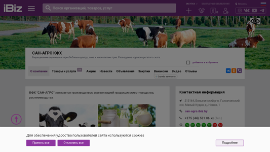 | AI-анализ | The website is a Belarusian agricultural company named САН-АГРО КФХ, specializing in the cultivation of grains, legumes, flax, and perennial plants, as well as in livestock breeding. The company's address is given as 213164, Belarus, Belynichsky district, Golutchinsky selsoviet, Maly Kudin d., Novaya, 1. The website provides information on the company's products and services, including milk and meat production from large cattle, grain production, and rapeseed production. It also mentions ongoing development, expansion of product offerings, and modernization of equipment. The website includes a map for directions, contact information, and operating hours. The company's main offerings are listed under the "Товары и услуги" (Goods and |