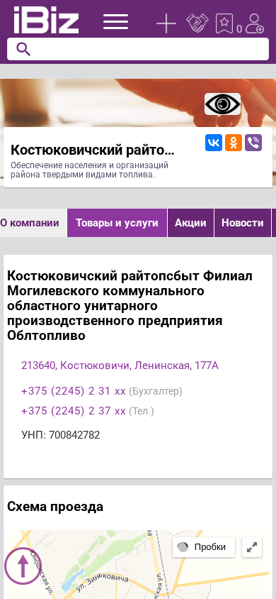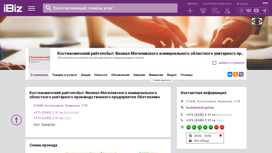 Название / ЗаголовокКостюковичский райтопсбыт Филиал Могилевского коммунального областного унитарного производственного предприятия Облтопливо - Обеспечение населения и организаций района твердыми видами топлива.. 213640, Костюковичи, , Ленинская, 177А