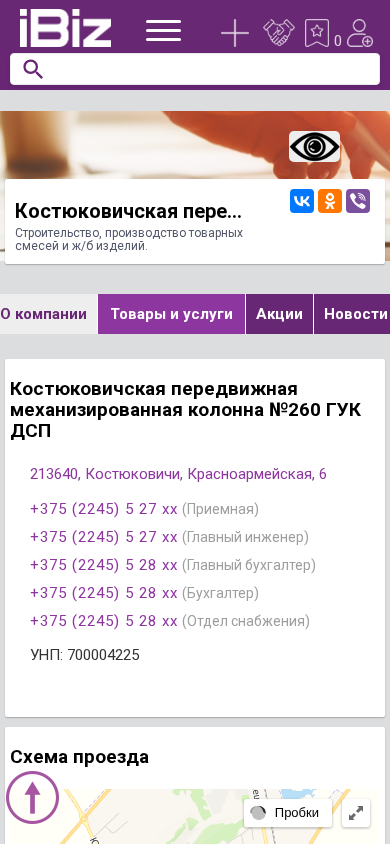 SEO-описаниеКостюковичская передвижная механизированная колонна №260 ГУК ДСП - Строительство, производство товарных смесей и ж/б изделий.. Схема проезда, контактные телефоны, адрес компании Костюковичская передвижная механизированная колонна №260 ГУК ДСП. 213640, Костюковичи, , Красноармейская, 6