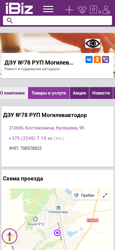 Название / ЗаголовокДЭУ №78 РУП Могилевавтодор - Ремонт и содержание автодорог.. 213655, Костюковичи, , Кулешова, 99