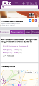 The portal kost-hleb.ibiz.by is a production site for the Belarusian company Домочай, specifically its Kostюковичский филиал branch. The main focus of the website is on the production and sale of hlebo-bulochnye (bread and baked goods) and kondiтерские (confectionery) izdeliya (items). The site provides contact information, including telephone numbers and an address in the city of Костюковичи. The company's UNP number is 700105505. The site includes sections for products and services, news, announcements, vacancies, videos, and customer reviews. The operating hours are listed as Monday through Friday, 9:00 AM to 6:00 PM, with no breaks for lunch. The site is categorized under Hlebo