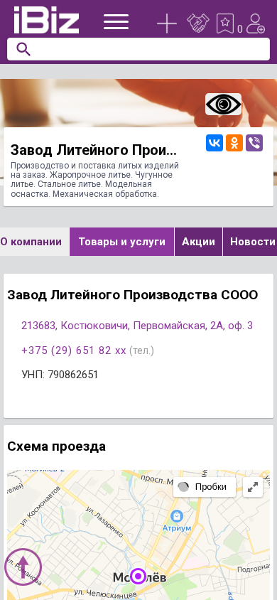 | AI-анализ | The portal Zavod Lisyego Produkcii SOOO offers custom production and supply of casted items. They specialize in heat-resistant, cast iron, and steel casting. Additionally, they provide model making and mechanical processing services. The company's address and contact information are provided, including a map scheme for easy navigation. 213683, Костюковичи, Первомайская, 2A, of. 3. |