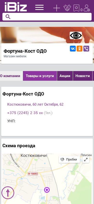 | AI-анализ | This online resource represents the website of Fortuna-Kost ODO, a furniture store located in the city of Костюковичи, Minsk region, Belarus. The site provides information about the store's address (60 лет Октября, 62), contact telephone number (+375 2245 2 35 xx), and a map scheme for reaching the location. The business offers furniture and related services. The website includes sections for company information, products and services, promotions, news, and customer testimonials on social media platforms such as VKontakte, Odnoklassniki, and Viber. The opening hours are from 9:00 to 18:00, Monday to Friday, with Saturdays and Sundays being days off. The site also features a rating system for companies and allows users to add the organization |
