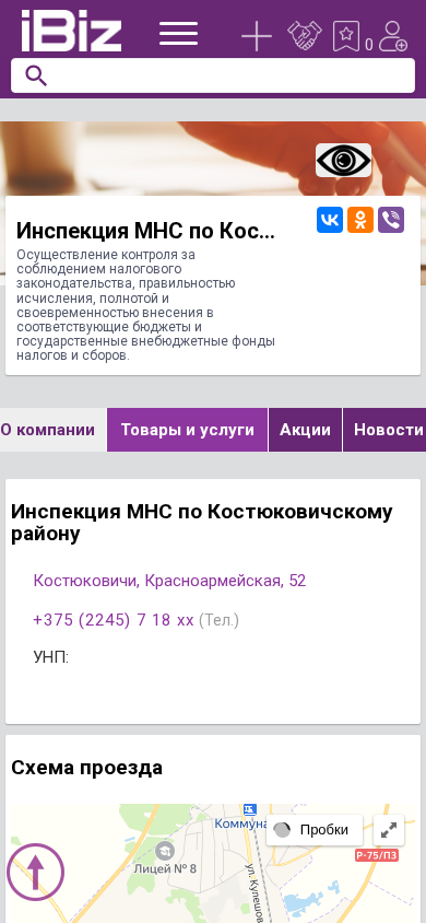 | AI-анализ | The portal imns-kostukovichi.ibiz.by is a website for the Tax Inspection of the Minsk City Executive Committee in the Costyukovich District. It provides information on the implementation of control over the compliance with tax legislation, the accuracy of calculations, the completeness and timeliness of contributions to appropriate budgets and state extra-budgetary funds for taxes and fees. The website includes sections for company information, goods and services, news, announcements, vacancies, videos, and reviews. Users can add the organization to their favorites and view statistics on contacts and opening hours. The company's contact information includes a phone number and address. The website is open for business from Monday to Friday, 9:00 AM to 6:00 PM, except for weekends. It operates under the terms of use and public contract of OOO "AIBIZ MEDIA |