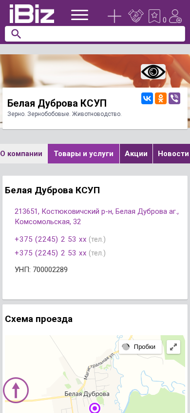 This online resource is dedicated to Belarusian agricultural cooperative Belaya Dubrova KSUP, which specializes in grain, legumes, and livestock production. The website offers various company information, products and services, contact details, and a scheme for reaching the location. The company is situated in the Kostyukovichy district, at Komsomoskaya 32, Belaya Dubrova ag. The contact numbers are provided as +375 (2245) 2 53 xx and +375 (2245) 2 53 xx. The business hours are listed as Monday to Friday from 9:00 AM to 6:00 PM without lunch breaks. The website also includes a section for news, announcements, vacancies, and customer reviews on social media platforms. The company is categorized under agricultural cooper