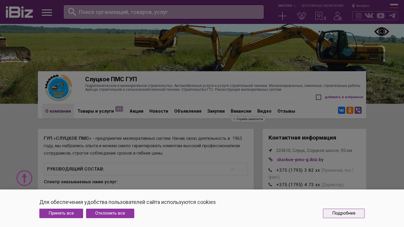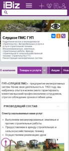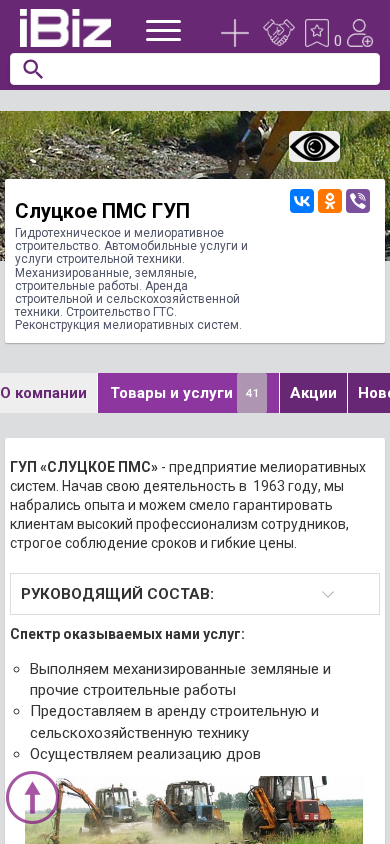 | AI-анализ | The portal is a government enterprise, Sluckee PMS GUP, offering hydrotechnical and meliorative construction services, as well as automobile services and rental of construction and agricultural equipment. The company specializes in mechanized, earthmoving, and other building works, and provides repairs and maintenance for its modern, technically equipped production base, which includes several repair workshops, a garage, and storage facilities. The fleet consists of various vehicles, such as cars (Shkoda Octavia, Chevrolet Niva, UAZ-390944, UAZ-2206, GAZ-32213, Paz-32053, GAZ-3309, KS35-79, MAZ 5516A5-371, MAZ-6422 A5, trailer MAZ-9 |