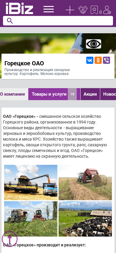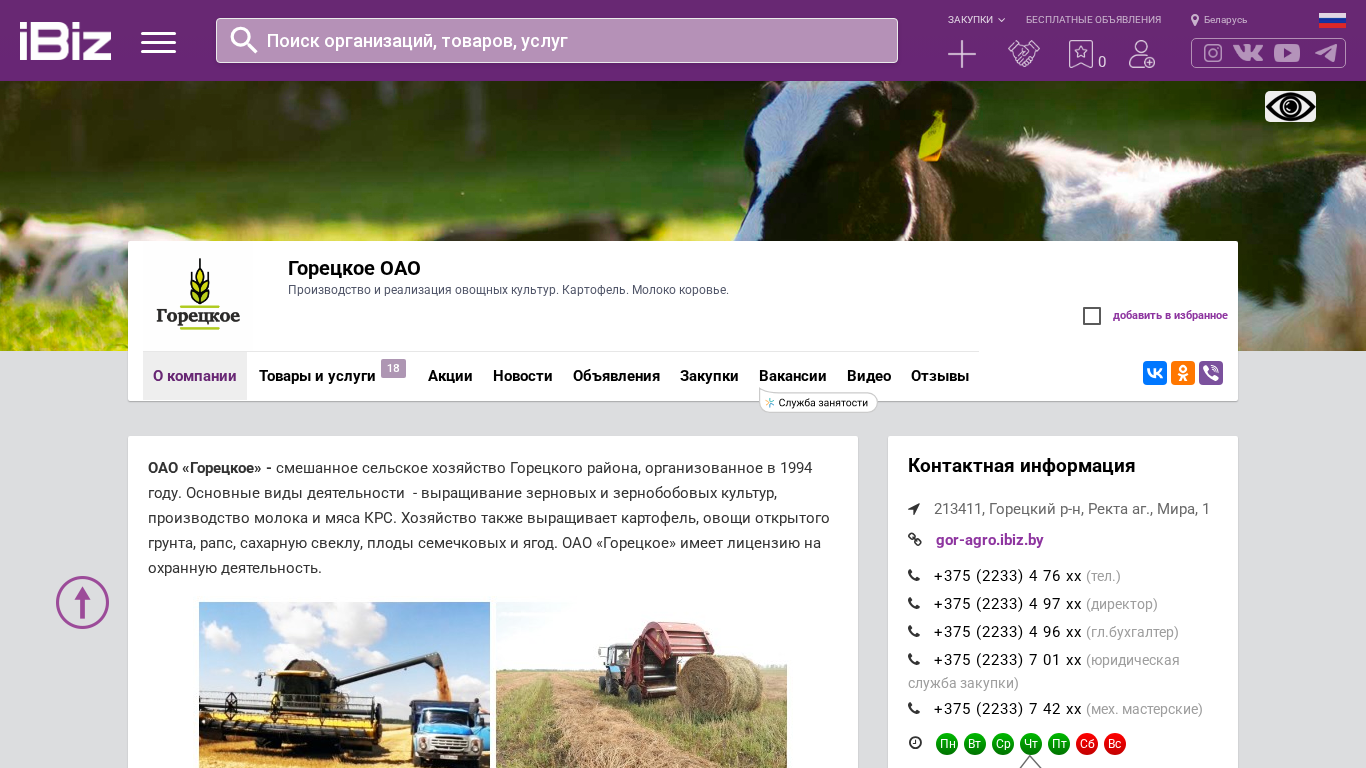 | AI-анализ | The web project "Gorцкое ОАО" is a Belarusian agricultural enterprise located in the town of Мира, Горецкий район, specializing in the production and sale of vegetable crops, potatoes, and dairy products. The company holds a license for protective activities. The website offers information on the company, its products and services, including crops such as zerno (grain), капуста (cabbage), картофель (potatoes), лук репчатый (onion), молоко (milk), морковь (carrot), мясо (meat), and свеклу (sugar beet). The site also provides contact information and operational hours for customer inquiries. The total agricultural land area of the enterprise is 12,893 ha, with 10,712 ha dedicated to agricultural production. The |