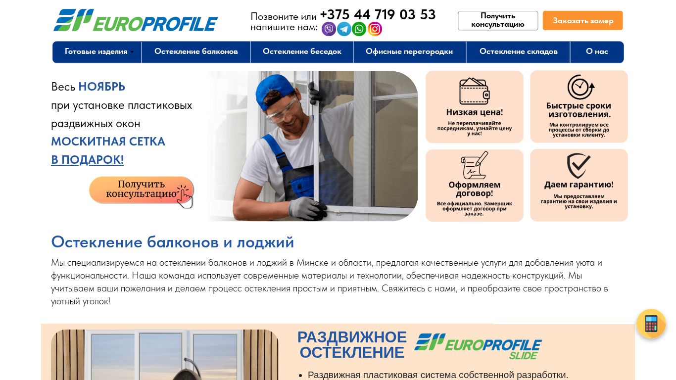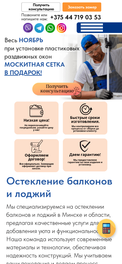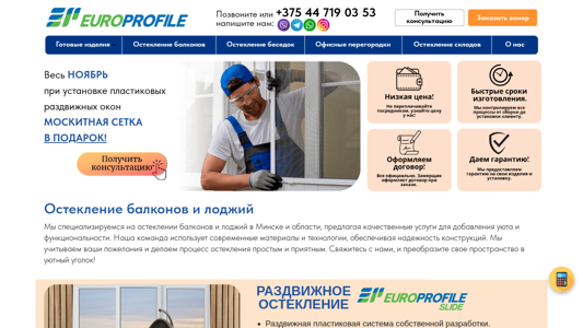 | AI-анализ | --- The website is a window installation company based in Minsk, Belarus, specializing in balcony and loggia glassing. With two decades of experience, they offer high-quality solutions with a guarantee. Their in-house production and free on-site measuring ensure ideal fitting and control at all stages. Customers can choose from various options including windows, doors, office partitions, and storage room glassing. The website provides a calculator and contact information for consultation and quotation requests. The company has been operating since 2007 and offers a free consultation and installation service. A promotional offer includes a mosquito net as a gift with all November installations of plastic sliding windows. |