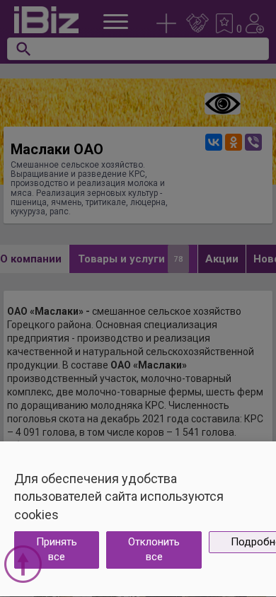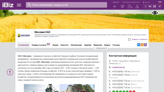 | Название / Заголовок | Маслаки ОАО - Смешанное сельское хозяйство. Выращивание и разведение КРС, производство и реализация молока и мяса. Реализация зерновых культур - пшеница, ячмень, тритикале, люцерна, кукуруза, рапс. . 213401, , Маслаки аг., Ленинская, 11 |