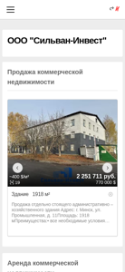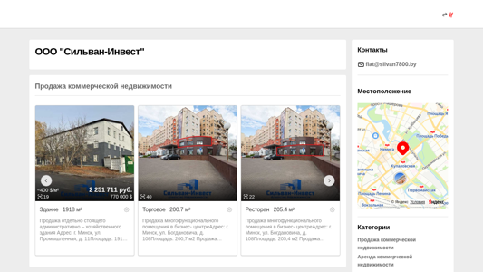The website of ООО "Сильван-Инвест" offers commercial real estate for sale and rent, including offices, production spaces, apartments, houses, garages, and land. The company has a large listing of properties for sale, such as a 1,918 m² administrative-commercial building located in Minsk, priced at 770,000 USD. The property comes with necessary conditions for operation, offices for administration, production areas, a cafeteria, concrete walls and floors, parking, ramp, 24/7 access, hot and cold water, sewage, and is situated near a bus stop. The buyer does not pay for real estate agent services. The contact agent is Andrey Smolka. The website also lists a 200.7 m² multi-functional space for sale in a business center in Minsk, priced at