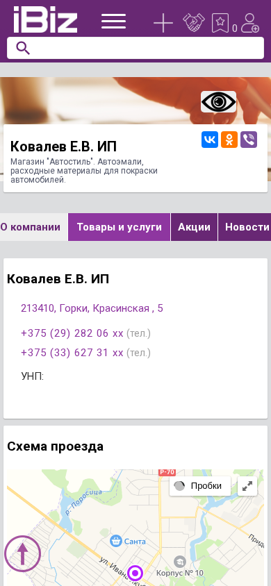 | Название / Заголовок | Ковалев Е.В. ИП - Магазин "Автостиль". Автоэмали, расходные материалы для покраски автомобилей.. 213410, Горки, , Красинская , 5 |