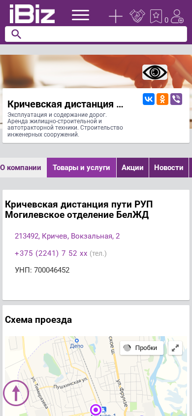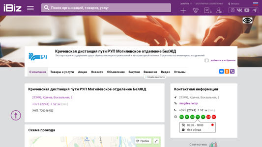 | AI-анализ | The web project "Krichev-disput.ibiz.by" is a Belarusian business website for Krichev Distance of Tracks RUP Mogilevskoe Odnolennie BelZHD, which provides services related to the exploitation and maintenance of roads, as well as the rental of residential and construction, and automotive equipment for building engineering structures. The website includes a map scheme, contact information, and business hours. The company is located at 213492, Krichev, Vokzalnaya, 2, and can be reached at +375 (2241) 7 52 xx. The company's Unified State Register number is 700046452. |