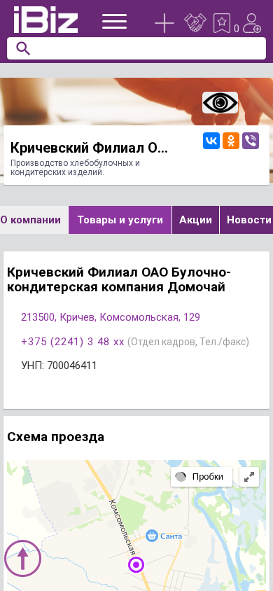 | AI-анализ | This website is for the Krichev Branch of OAO Bulochnokonдитерskaya Compania Domochay, which produces bread, baked goods, and confectionery items. The address and contact information, including phone numbers and a fax number for the human resources department, are provided. The company's UNP number is 700046411. The website includes sections for company information, products and services, news, job listings, videos, and customer reviews on various social media platforms. The main product categories are hlebobulochnye izdeлия (bread and baked goods) and konditerskie izdeilia (confectionery items). The company produces a range of items, including cakes, pastries, pies, and bread. The website also mentions the production of beverage and goftotary (hollow pastry |
