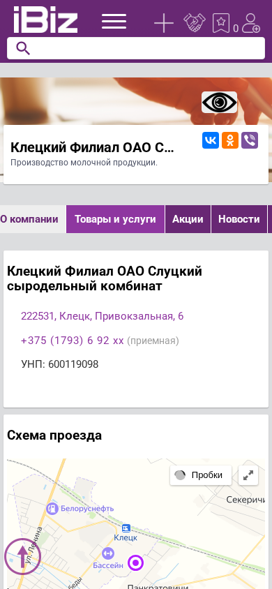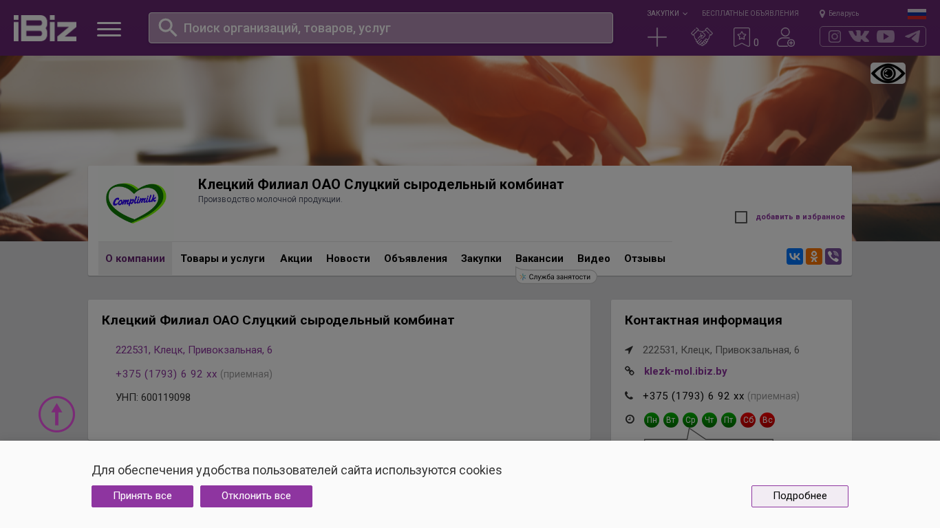 | Название / Заголовок | Клецкий Филиал ОАО Слуцкий сыродельный комбинат - Производство молочной продукции.. 222531, Клецк, , Привокзальная, 6 |