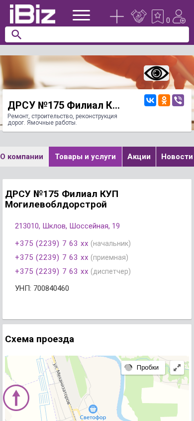 | Адрес | Объявления, Закупки, Вакансии, Видео, Отзывы, ДРСУ №175 Филиал КУП Могилевоблдорстрой, 213010, Шклов, Шоссейная, 19 |