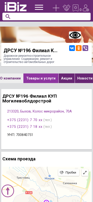 | AI-анализ | This website is for ДРСУ №196 Филиал КУП Могилевоблдорстрой, a branch of the Moгилевоблдорстрой construction company specializing in the maintenance, repair, and construction of automobile roads. The site includes information about the company, its products and services, contact details, and a map for directions. Keywords associated with the website include numbers in the Belarusian international dialing code (375), the words 'услуги' (services), 'тел' (telephone), 'закупки' (purchases), 'объявления' (advertisements), 'дорожно-строительные' (road-building), 'работы' (works), and 'техника' (technology). The company's Unified State Register number is 7008 |