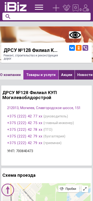 | AI-анализ | The portal is a branch website for ДРСУ №128, a filial of КУП Могилевоблдорстрой, which specializes in road repair, construction, and reconstruction. The site provides a map for directions, contact phone numbers, and the address of the company. It features sections for company information, products and services, and various announcements, including job vacancies, news, and advertisements for goods and services. The site's top words include '375', 'без', 'компании', 'дрсу', 'филиал', 'куп', 'дорожно-строительные', 'работы', 'техника', 'услуги', 'закупки', and 'объявления'. The Unified State Register number of the company is 700840473. The site operates Monday to |