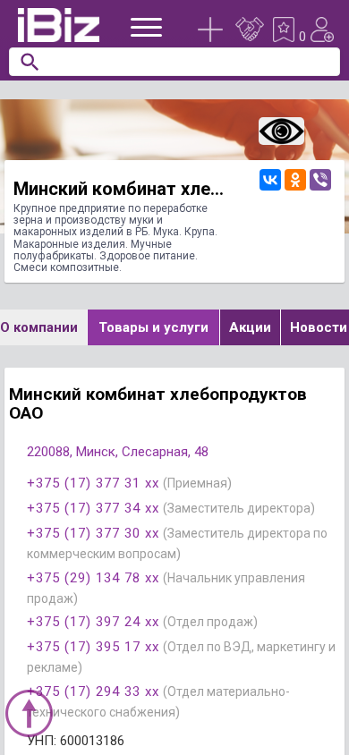 | AI-анализ | The website is a business-to-business platform for Miniski kombinat hleboproduktov OAO, a large enterprise in Belarus for the processing of grain and production of flour, pasta, and baked goods. The platform provides information about the company, its products and services, as well as contact details and opening hours. The main categories of products include flour, cereals, pasta, semi-finished baked goods, and healthy food. The website also features a section for job vacancies and company news. The contact information includes several phone numbers for different departments and an email address. The company's UNP number is 600013186. The website is located at 220088, Minuskaya Slesarhnaya, 48 in Minsk. |
