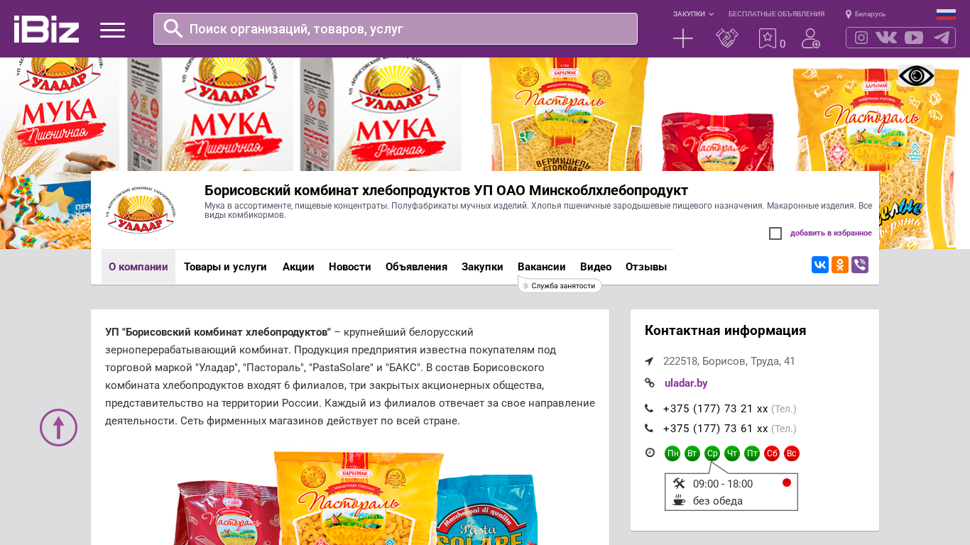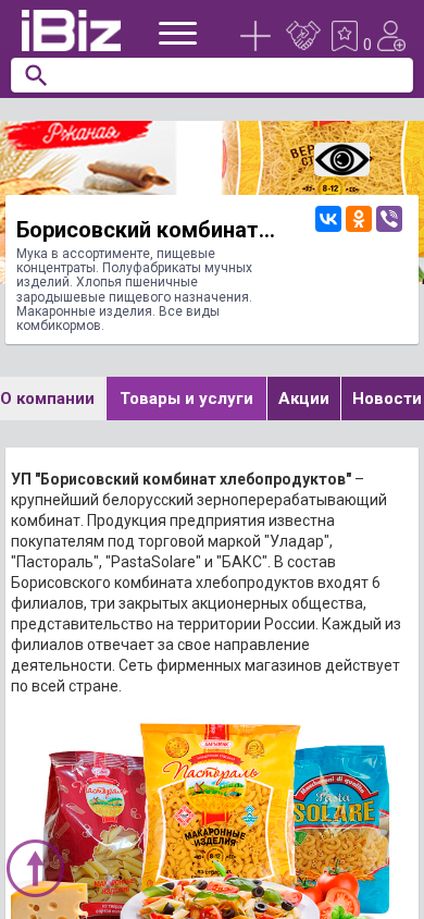 | AI-анализ | The portal is a website for Borisovsky Combine of Hleboproducts UP OAO Minskoblhleboproducts. It offers a range of flour products, food concentrates, semi-finished bakery products, and cereals. The website also includes information on the company, its locations, and contact details. Borisovsky Combine of Hleboproducts is a major grain processing plant in Belarus, producing and distributing flour, grain products, semi-finished bakery items, and cereals under various brand names such as "Uladar", "Pastoral", "PastaSolare", and "Baks". The company has six branches, three closed joint-stock companies, and a representative office in Russia. Each branch specializes in a particular area of production. The company operates a network of retail stores across Belar |