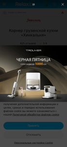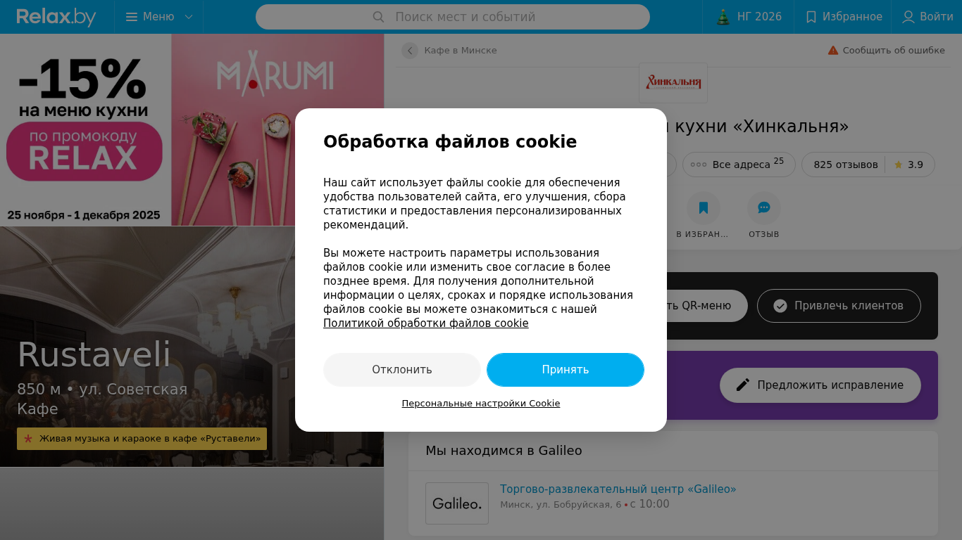 | AI-анализ | The website is a restaurant corner called "Хинкальня" offering Georgian cuisine in Minsk, Belarus, located at ul. Bobruyskaya 6. The site provides menu prices and photos, customer reviews, an address map, and online table reservation through Relax.by. Keywords include "corner," "Georgian cuisine," and "Минск." The top viewed pages are the menu search, locations and events section of NG 2026, and the favorite list. The restaurant is in the Galileo shopping center and is open from 10:00 to 23:00. The type of establishment is a corner. Other nearby establishments include Rustaveli, a cafe with live music and karaoke, and Marumi, a pan-Asian restaurant offering a 15% discount with the promo code |