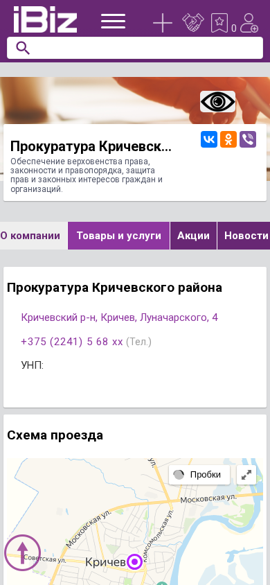 | Название / Заголовок | Прокуратура Кричевского района - Обеспечение верховенства права, законности и правопорядка, защита прав и законных интересов граждан и организаций.. 0, Кричев, , Луначарского, 4 |