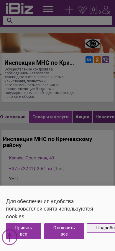 | Название / Заголовок | Инспекция МНС по Кричевскому району - Осуществление контроля за соблюдением налогового законодательства, правильностью исчисления, полнотой и своевременностью внесения в соответствующие бюджеты и государственные внебюджетные фонды налогов и сборов.. 0, Кричев, , Советская, 49 |