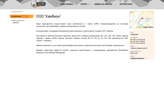 | AI-анализ | The website is for OOO "Камбион", a Belarusian company specializing in the sale of parts for asphalt paving equipment and caterpillar graders. The company, established in 1995, collaborates with leading manufacturers of road construction machinery in the CIS and Europe. A wide range of parts for asphalt paving machines such as DS-126, 143, 195, ASFK from Irmaash and Arsenal factories in Briansk, and catgraders DU-54, 58, 62, 63, 84, 100 from Raskat factory in Rybinsk are always in stock. The company also offers delivery of large components using its own transportation. Major road construction and utility companies in Belarus and the Russian Federation are among their clients. |