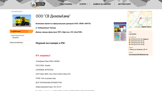 | AI-анализ | The website is for OOO "СВ ДизельКама," a Belarusian company specializing in diesel trucks, offering services and goods for sale. The main product categories are spare parts, machinery, equipment, and services including repair, rental, and financing for cargo transportation. The company is the official dealer for several manufacturers, including АМТК, Эфатон, and БелТИЗ. The website provides detailed information on the offered parts, such as those for Maz and KamAZ models, as well as turbines from Czech and Polish manufacturers. The contact information includes several phone numbers and an email address. |