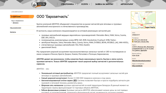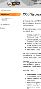 | AI-анализ | This website is for the Belarusian company "European Spare Parts" (OOO "Еврозапчасть"), which is part of the ARMTEK group specializing in the wholesale trade of spare parts for light and heavy vehicles of foreign and domestic production. The company focuses on the sale of spare parts for heavy vehicles from leading European manufacturers such as Mercedes-Benz, MAN, Volvo, Scania, DAF, RVI, IVECO, as well as trailers equipped with axles from BPW, SAF, ROR, Kassbohrer, Fruehauf, SMB, Trailor, and buses from Neoplan, Setra, Mercedes-Benz, Scania, Volvo, MAN, EVOBUS, BOVA, IRISBUS, LAG, and VAN-HOOL, and domestic vehicles from GAZ, M |
