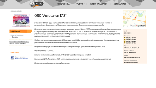 The portal "ОДО «Автосалон ГАЗ»" is a specialized online marketplace for the sale of spare parts, equipment, and services for GAZ and UAZ automobiles. With over 3000 available items, including certified spare parts, this Belarusian business has been in operation for 18 years, providing essential supplies for maintaining the technical readiness of these vehicles. The store's convenient location near the MKAD in the 'Курасовщина' microdistrict allows for efficient pick-up, and the operational document processing and merchandise release take place in the trade hall. The business operates from 8:30 AM to 5:30 PM, Monday through Friday. The contact details include several phone numbers and an email address, while the physical address is given as Minsk, Ul. Lander, 2. The
