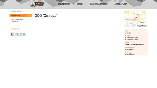 | AI-анализ | The website is for OOO "Oligard", a company based in Minsk, Belarus. The site offers various services and goods related to special technology, machinery, equipment, parts, and services such as repair, rental, credit/leasing, and cargo transportation. Users can make inquiries and place requests for purchasing. The site includes a price list for download, as well as an auto catalog and contact information, including phone numbers, address, and email. The domain is registered under the .BY extension and is hosted on Adz.by. The company's Unified State Register number is 190346354. |