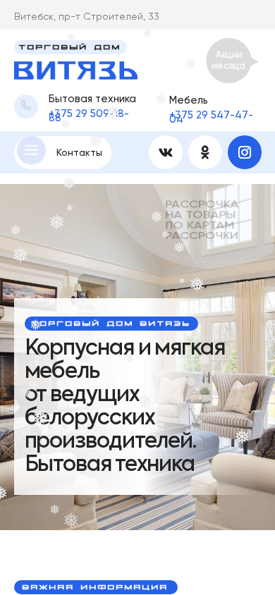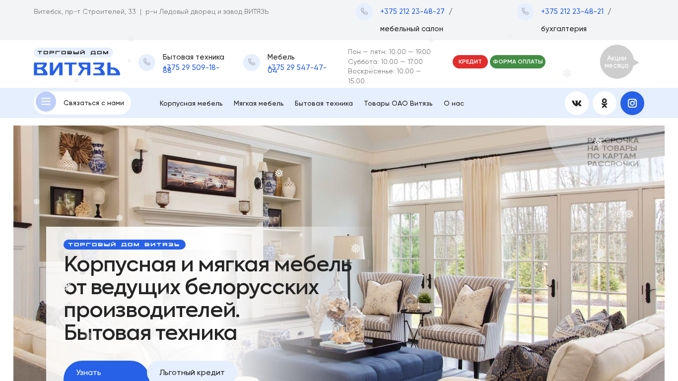 | SEO-описание | Торговый дом "Витязь" в Витебске предлагает приобрести широкий ассортимент корпусной и мягкой мебели, бытовой техники и электроники. |