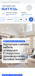 | AI-анализ | The portal "Trading House Vityaz - Furniture. Home Appliances and Electronics" is a Belarusian e-commerce website based in Vitsebsk, offering a wide range of furniture, home appliances, and electronics for purchase. The company, Trading House Vityaz, is located on Prospect of Builders, 33, in the Leninsky District, near the Vityaz Industrial Plant and the Ice Palace. The website provides contact information for the furniture showroom, the accounting office, and the home appliance store, all with different phone numbers. The trading hours are Monday to Friday from 10:00 to 19:00, Saturday from 10:00 to 17:00, and Sunday from 10:00 to 15:00. The website mentions credit options and ongoing promotions |