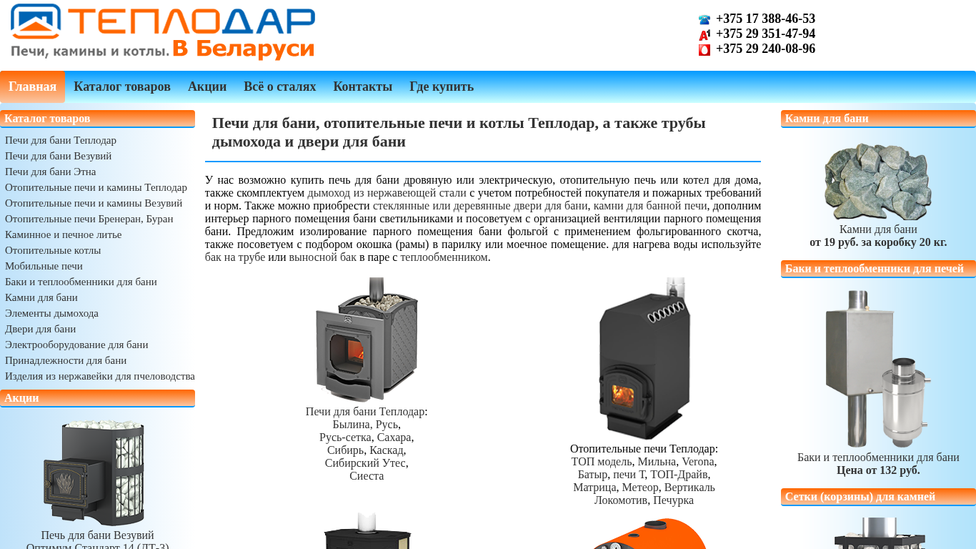 SEO-описаниеПечи для бани, отопительные печи и котлы Теплодар, двери и камни для бани, банные принадлежности, дымоходные трубы из нержавеющей стали. Подбор печи или котла, консультация в комплектации дымохода.