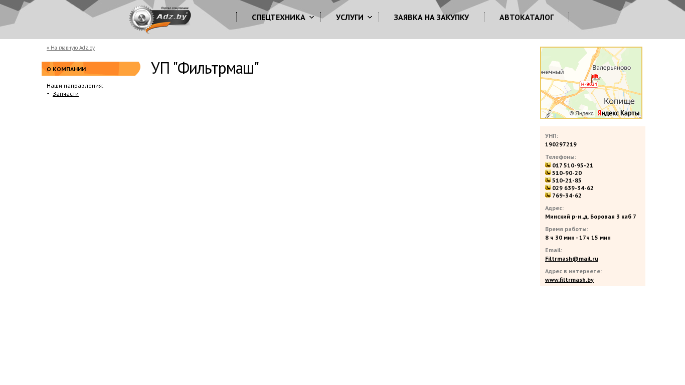 | AI-анализ | language: ru The web project "УП "Фiltrmash" is a Russian-language business website dedicated to selling and servicing specialized machinery, equipment, and spare parts. The site provides information on the company's offerings, which include filters, technical services, rental, repair, financing, transportation, and a request for quote feature. The domain is registered under the .BY top-level domain and hosted on the Adz.by platform. The company's contact information, including phone numbers, email address, and physical address, are provided on the site for customer inquiries. The site is accessible Monday through Friday from 8:30 AM to 5:15 PM. |