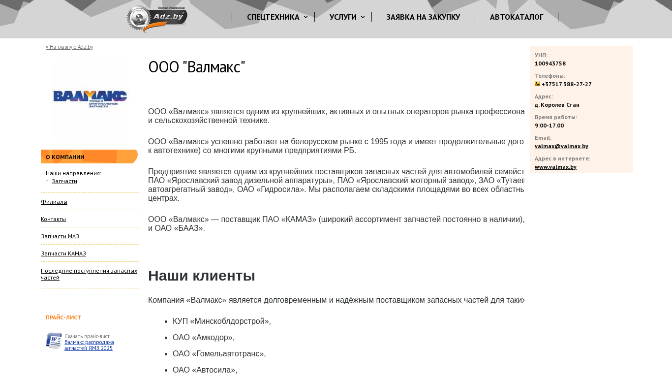 | AI-анализ | The website is a business-to-business platform for OOO "Валмакс," a major supplier of spare parts for automotive and agricultural machinery in Belarus. Established in 1995, the company has long-term contracts with various large Belarusian enterprises, including major automotive and agricultural machinery manufacturers. The website provides information on the company's offerings, including spare parts for brands such as KAMAZ, MАZ, Kiruvets, and others. It also features a price list and contact information. The company operates in all major regional centers and large district centers in Belarus and is a supplier for major automotive and agricultural machinery manufacturers like PAO "KAMAZ," PAO "Autodiesel," PAO "Yazda," OAO "MAZ," and OAO "BAZ." Key clients include Minskobdor |