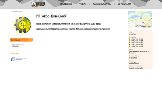 | AI-анализ | The portal Agro-Don-Snab is a Belarusian business-to-business (B2B) platform specializing in the sale of spare parts for agricultural machinery. The top keywords associated with the site include "price list," "parts," "Agro-Don-Snab," and "purchase request." The site offers services related to repair, rent, credit/leasing, and transportation of agricultural equipment. Other top words include "technology," "equipment," "services," and "address." The company's Unified State Register of Enterprises and Organizations number is 190437992. The contact details provided include phone numbers, an email address, and a physical address in the Minsk region. The site is operated by Adz.by, and was first established in 2003. |