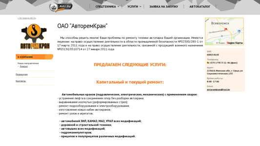 | AI-анализ | --- The website "ОАО "АвторемКран" (avtoremkran.adz.by) is dedicated to providing repair services for various types of machinery and equipment, with a focus on cranes. The company's offerings include both routine and major repairs, as well as the fabrication of new cabins for cranes. They specialize in the repair of industrial equipment, including cranes (hydraulic, electric, and mechanical), automobiles (ZIL, KAMAZ, MAz, URAL), and construction machinery. The company holds licenses for industrial safety and for work related to military equipment. Services offered include diagnostic testing and full certification of cranes with lifting capacities up to 32 (40) tons. They also repair hydraulic systems for automobile cranes and check the moment of force on the pivot joints. |