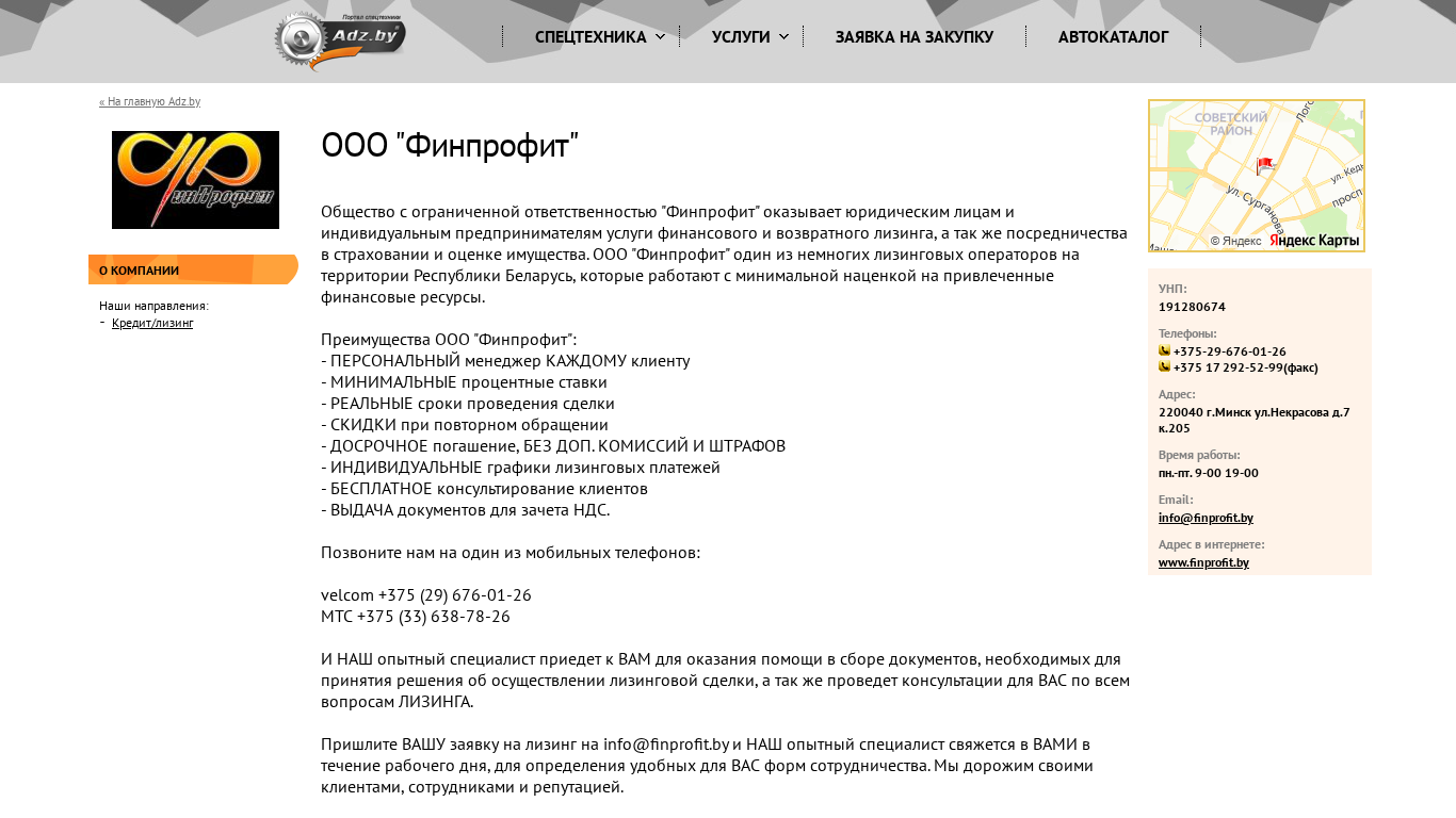 | AI-анализ | The web project "Финпрофит" (Finprofit) is a Belarusian limited liability company that offers financial and return leasing services, as well as brokerage in insurance and property appraisal to legal entities and individual entrepreneurs. Finprofit is among the few leasing operators in Belarus with minimal markups on attracted financial resources. The project's advantages include personal managers for each client, minimal interest rates, short deal completion times, discounts for repeat clients, and no extra charges or penalties for early repayment. Clients can benefit from individualized leasing payment plans, free consultation services, and document issuance for tax deductions. Contact information includes phone numbers for Velcom and MTS networks, an email address, and a physical address in Minsk. Financing inquiries can be submitted via email. The project is operated by Adz.by. |