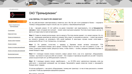 | AI-анализ | The portal Premierlizing is a Belarusian business-to-business platform providing various services and products related to leasing, including specialized equipment, machinery, parts, and services such as renting, repair, and credit/leasing. The company, OAO "Premierlizing," offers its clients solutions for leasing real estate and vehicles, as well as a return leasing option. The contact information for the company includes a Unified State Register of Enterprises number (101499224), several phone numbers, a fax number, and an email address. The website address is <http://www.premier.by/>. Despite the company's claim that leasing is always more expensive than a loan, they mention that in many cases, leasing can be as cost-effective as a zero-interest loan for 2-5 years due to tax savings. The |