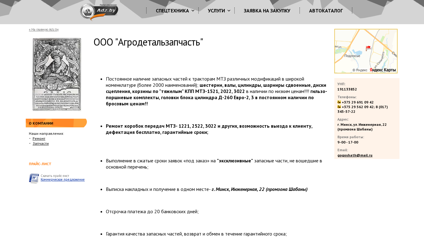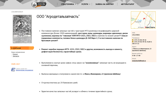 | Адрес | Агродетальзапчасть", Постоянное, наличие запасных частей к тракторам МТЗ различных модификаций в широкой номенклатуре (более 2000 |