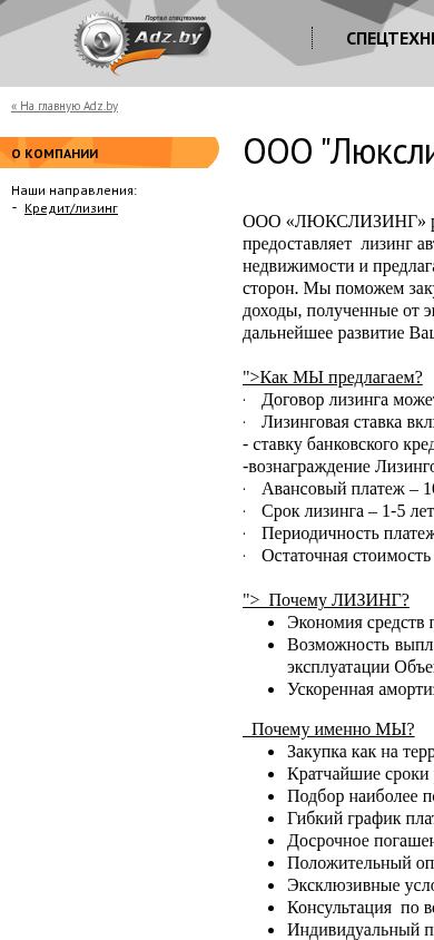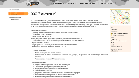| AI-анализ | The website "ООО 'Люкслизинг' (LuxLeasing LLC) is a leasing company based in Minsk, Belarus, which has been operating since 2003. The company offers vehicle, specialized equipment, and real estate leasing, and aims to provide mutually beneficial collaborations. Users can find information on the company's services, including leasing terms and conditions, and contact details for inquiries. Keywords associated with the website include leasing, financing, equipment, and services. The domain is registered with Adz.by. |