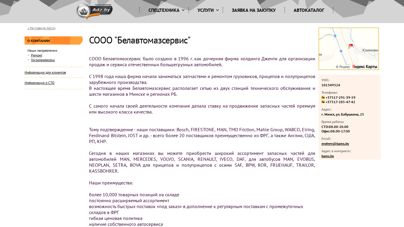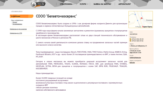 | AI-анализ | The website "Белавтомазсервис" (bams.by) is a Belarusian company established in 1996 as a subsidiary of the holding Dженти for the sale and service of domestic heavy-duty trucks. Since 1998, the company has been dealing with spare parts and repairs of foreign heavy trucks, trailers, and semi-trailers. Currently, Белавтомазсервис (Belavtomazservis) operates two service stations and six retail stores in Minsk and the regions of Belarus. From the start, the company has focused on promoting premium quality spare parts. This is evidenced by their suppliers, which include Bosch, Firestone, MAN, TMD Friction, Mahle Group, WABCO, Elring, Ferdinand Bilstein, JOST, and over 20 |