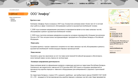 | AI-анализ | The portal Amafor.adz.by is a Belarusian business website belonging to OOO "Amafor," a company specializing in specialized technology, equipment, parts, and services, including rental and repair, as well as credit/leasing and cargo transport. The company was established in 2007, with founders having over ten years of experience in the technical servicing and repair of heavy commercial vehicles. Since 2008, the company's primary focus has been on supplying spare parts, servicing and repairing heavy commercial vehicles. From 2009 onwards, the company's strategy has been to expand into subsidiaries in most regions of Russia and the CIS. Currently, functional subsidiaries operate in Belarus and Russia. The company aims to create a large trading and service holding company for the supply of spare parts, servicing, and repair of |