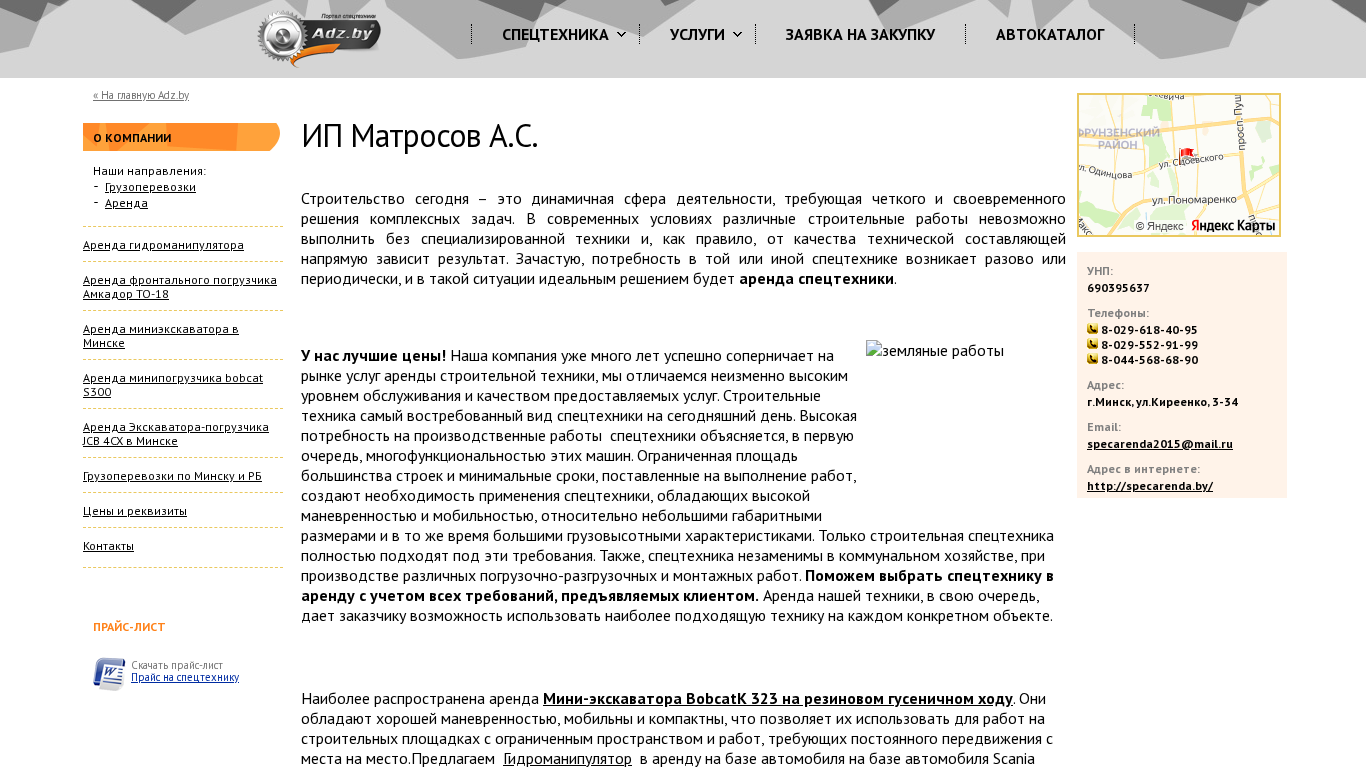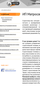 | AI-анализ | The website is for the Belarusian company "IP Matrosov A.S." which specializes in the rental and repair of construction equipment and machinery. The top keywords are 'ренда' (rent), 'техники' (technology), 'грузоперевозки' (cargo transportation), 'минске' (Minsk), and 'спецтехника' (special technology). The company offers a range of services including equipment rental, repair, credit/leasing, and cargo transportation. The website lists various types of machinery available for rent such as hydraulic manipulators, front-end loaders, and excavators. The company also provides contacts for inquiries and a price list for download. The domain is registered under the .BY extension for Belarus. |