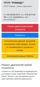 | AI-анализ | This website is a repair shop for engines of all complexities called "РИМИДА" located in Minsk, Belarus. The company provides engine repair services and offers the production of doors, windows, interior partitions, cabinets, showcases, and ventilation systems made of aluminum profile and glass. The pricing for the services is individual for each order, and both cash and non-cash payments are accepted. The contact information includes phone numbers +375-29-635-35-07 and +375-29-77-66-335, as well as an email address: rimida@list.ru. The website address is www.rimida.by. The shop's last update was in February 2025. |