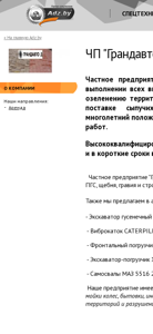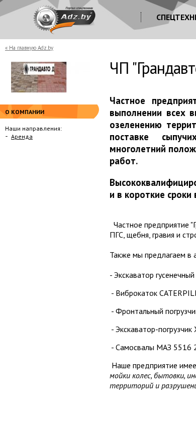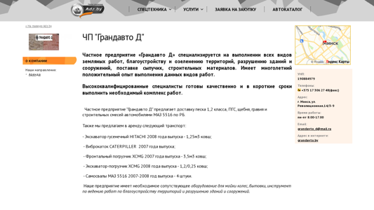 | AI-анализ | The web project "ЧП "Грандавто Д" (Grandavto D) is a private enterprise specializing in various types of earthworks, landscaping and landscaping, demolition of buildings and structures, and the supply of construction materials. With a long-standing positive track record, Grandavto D employs highly qualified specialists capable of delivering high-quality work in a short timeframe. The company offers delivery of Class 1.2 sand, PGS, gravel, and building mixtures using Maz 5516 trucks. In addition, Grandavto D rents out the following equipment: a Hitachi excavator from 2008 with a 1.25m³ bucket; a Caterpillar vibrating compactor from 2007; an XCMG front loader from 2007 with a 3.5m |