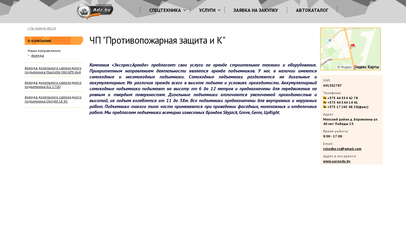 | AI-анализ | The web project "ЧП "Противопожарная защита и К" (pzashita.adz.by) is a Belarusian company specializing in equipment and service rentals. The company prioritizes the rental of lifting equipment. They offer both self-propelled and stationary lifting equipment, with the former categorized into diesel and accumulator-powered models. Diesel self-propelled lifting equipment can reach heights of up to 38 meters and is suitable for rugged terrain. Accumulator-powered self-propelled lifting equipment can reach heights of up to 12 meters and is ideal for smooth and firm surfaces. The company provides lifting equipment for both indoor and outdoor projects and is commonly used for facade work, installation, and finishing tasks. Brands offered include Skyjack, Grove, Genie, and UpRight. The company's |